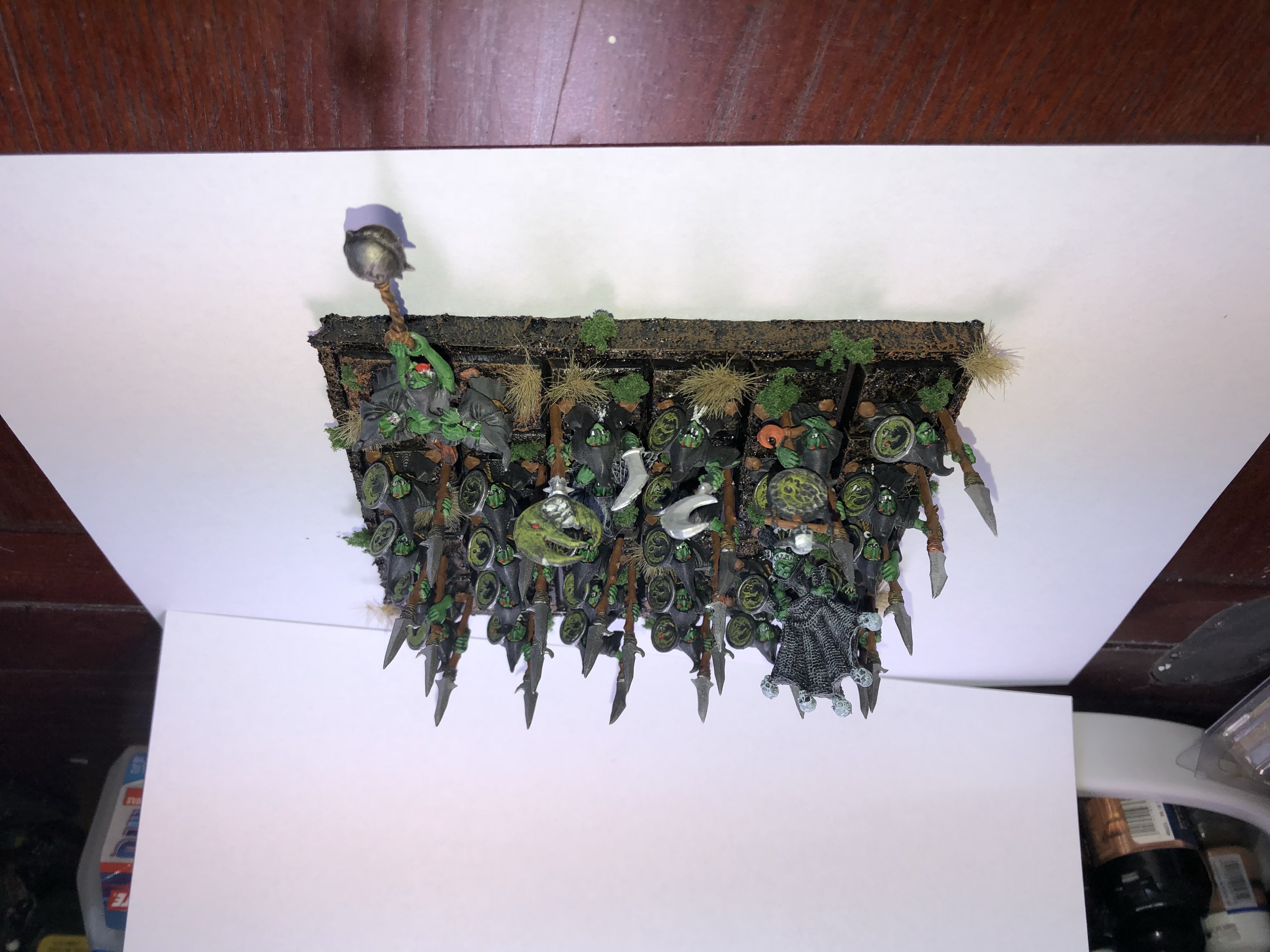 Goblin Infantry - These are a mix of 4th / 5th edition pewter models and a bunch that I picked up from a Kickstarter that I backed. I think that all the models were sculpted by Kev Adams but I'm not positive. In any case, these have a really great classic feel to them. Now that I have them, I think they're the first unit of "vanilla" goblins that I've put together since the old 4th edition monopose spearmen (of which still I have like a hundred...). [1]